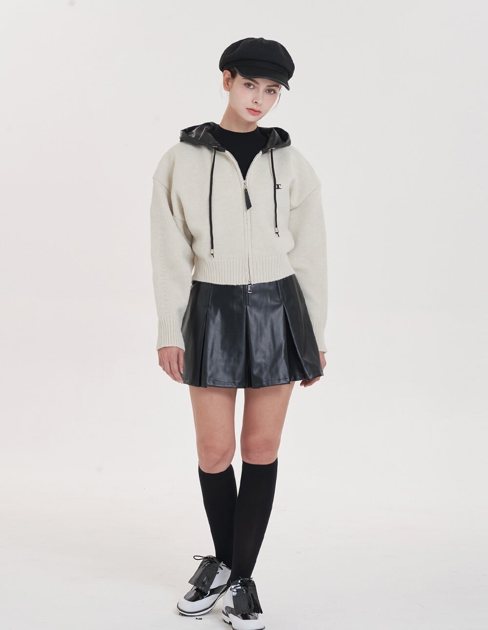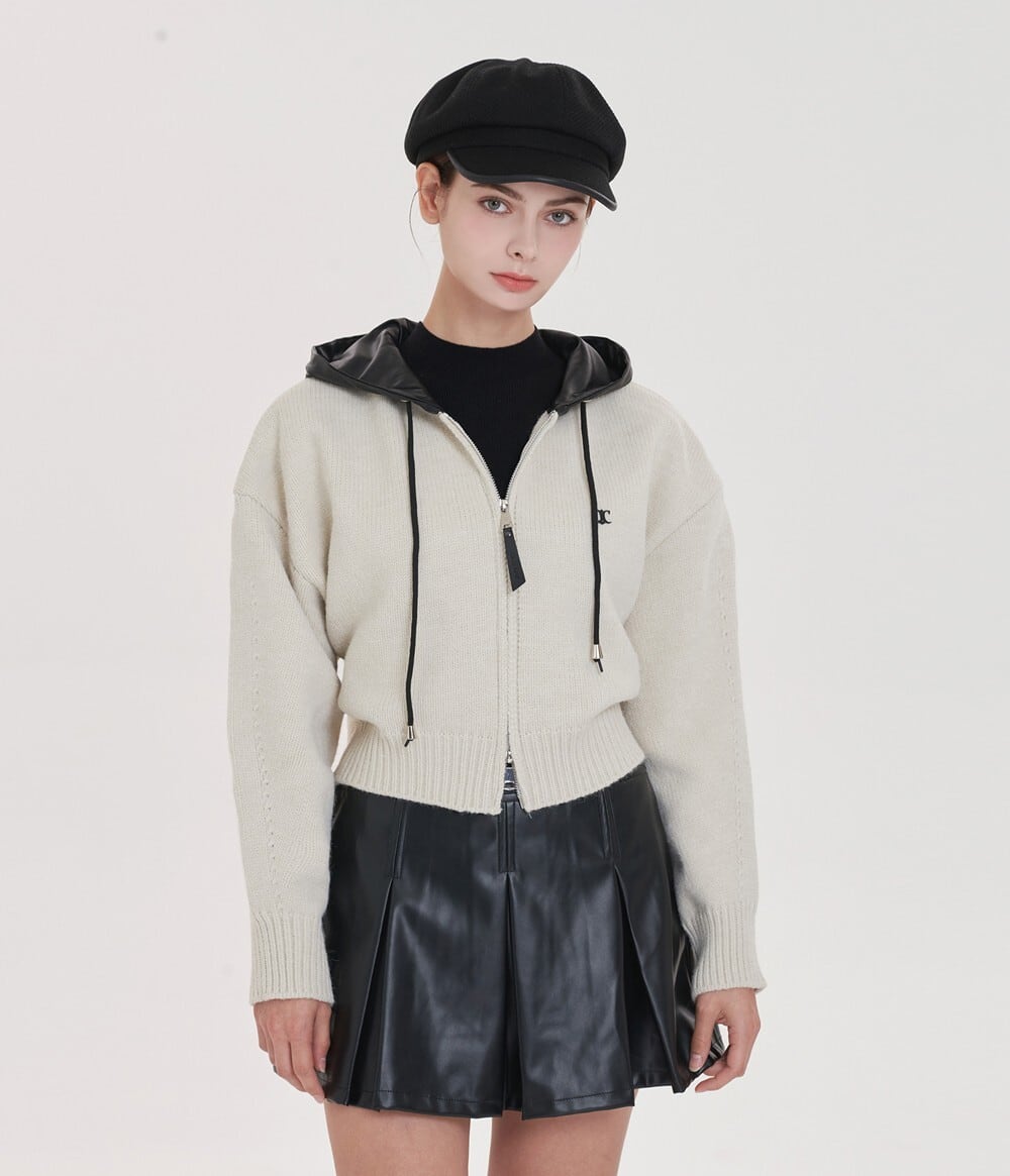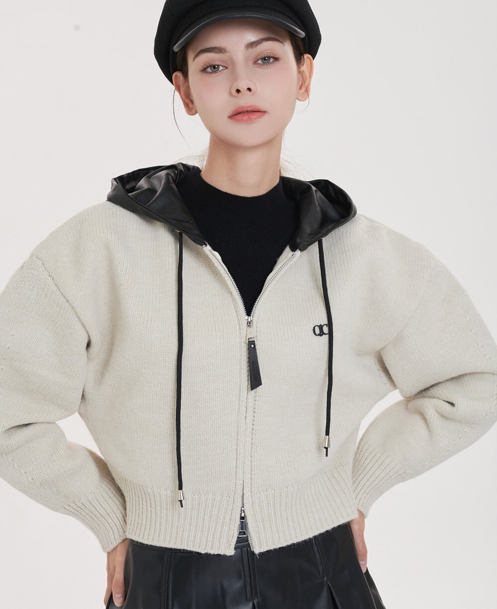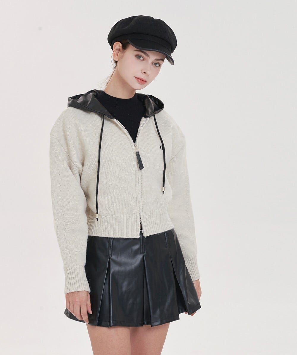 ・厚手のニットジップカーディガンにレザー素材のフードをポイントにしたデザイン。
