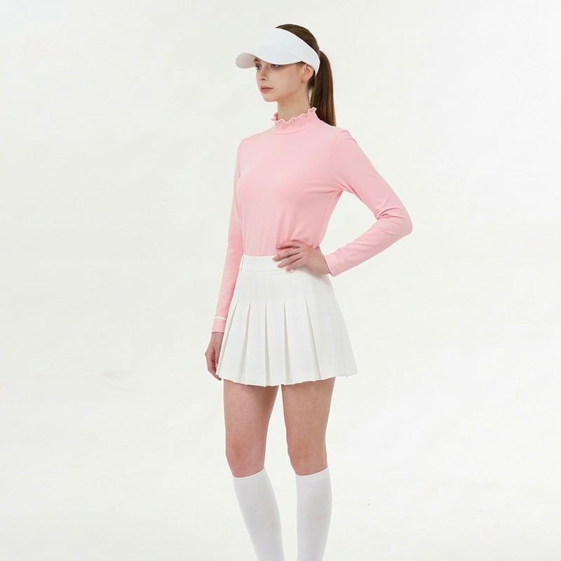 ・襟元に繊細なフリルをあしらったリブ編みモックネックデザインでインナーのコーデにもおすすめ