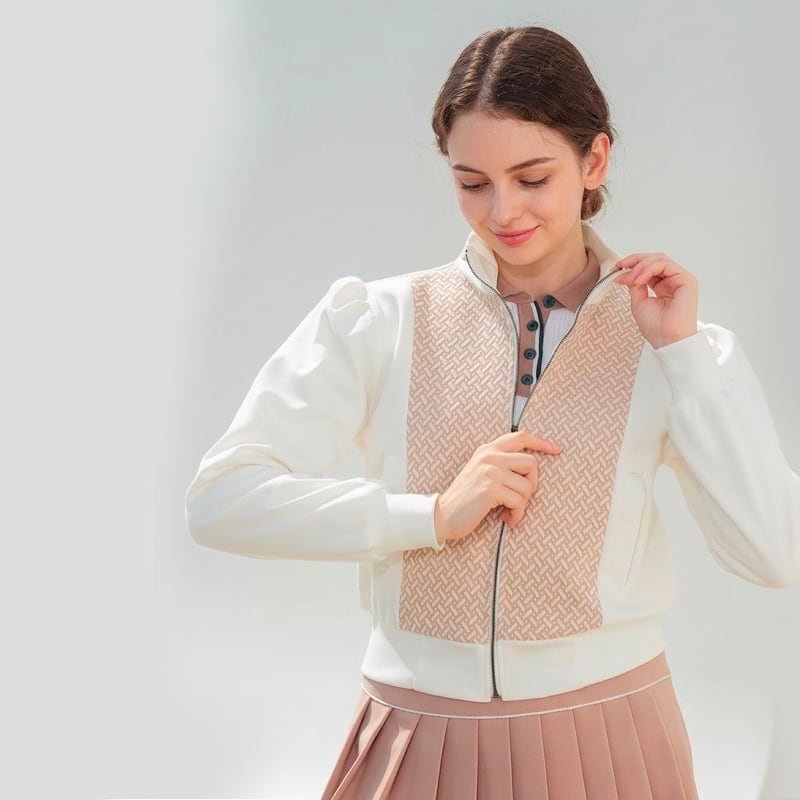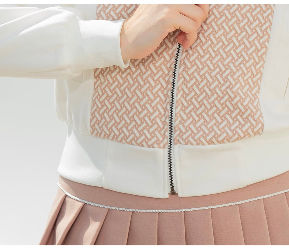 ・ベージュのチェック柄がアクセントになった、スタイリッシュなジップアップジャケット。