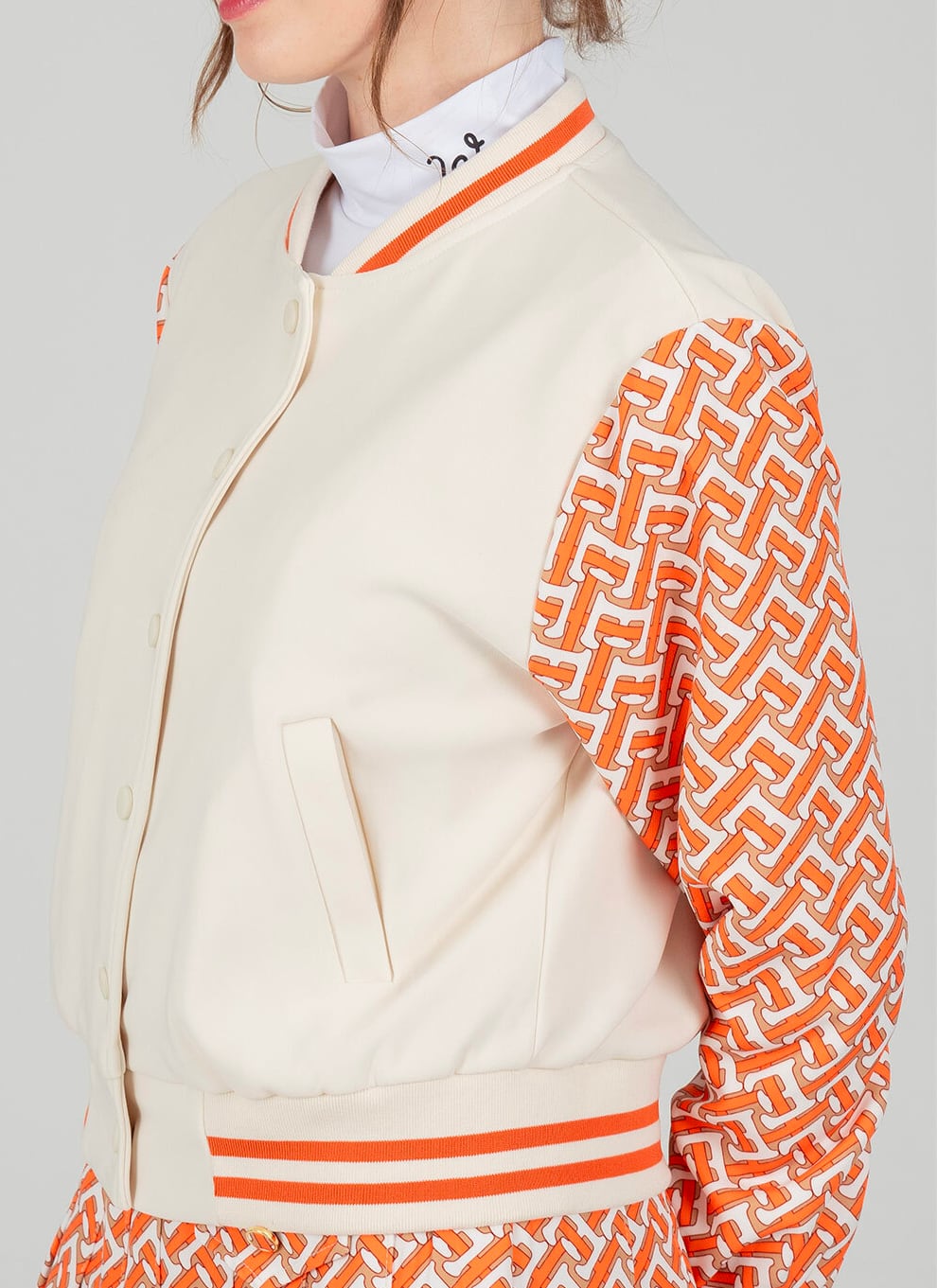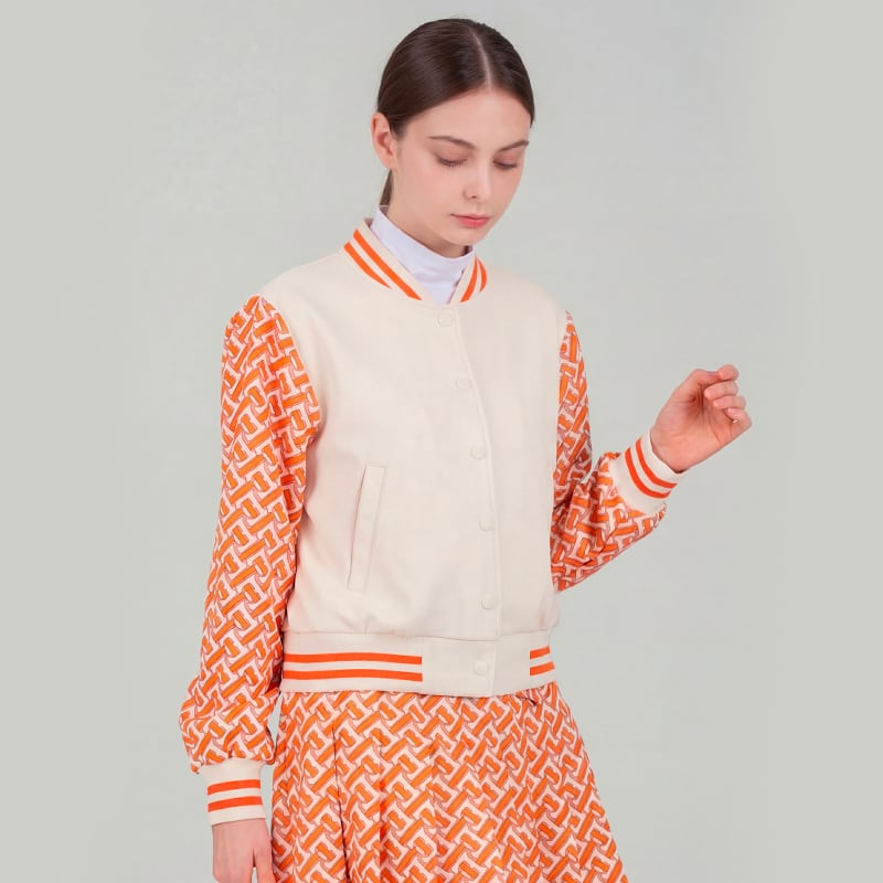・ジャケットは白いボンバージャケットスタイルで、オレンジのプリントの袖がアクセント。