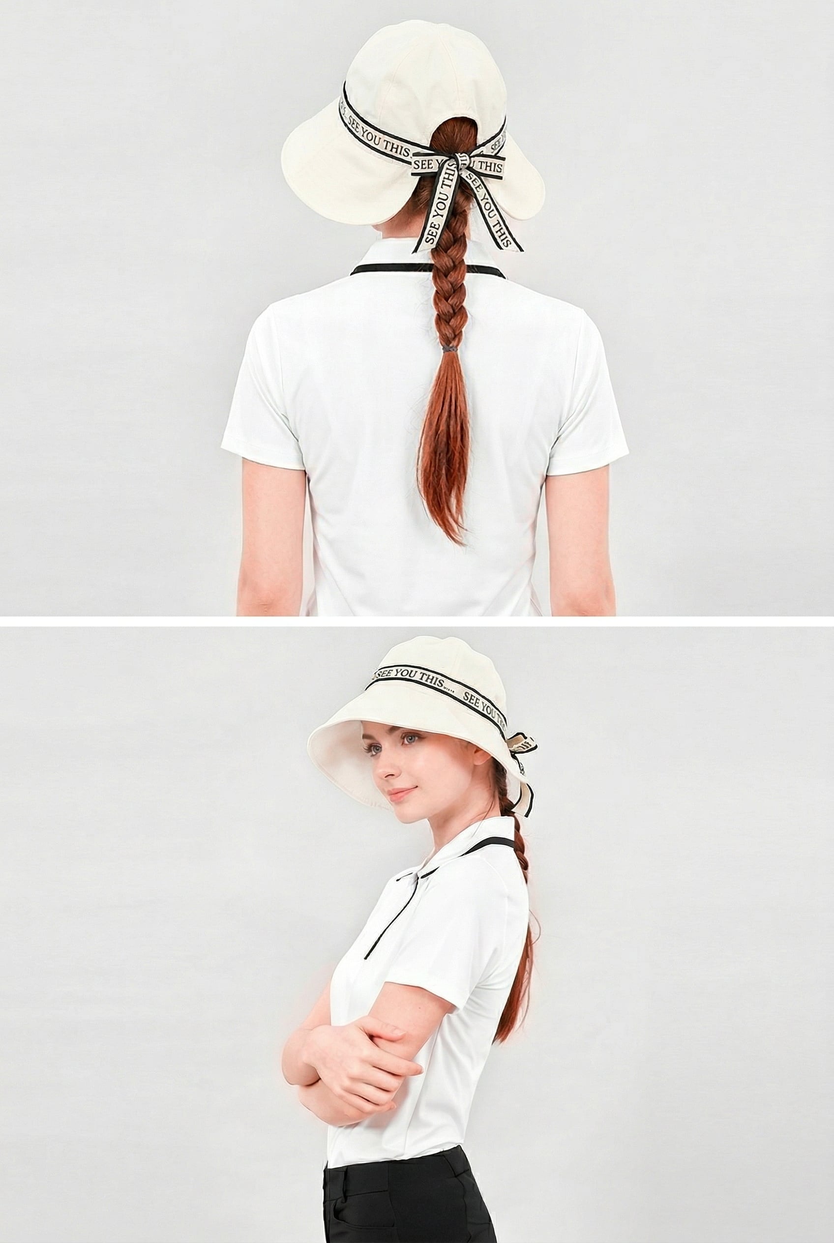 ・後ろにはさりげないリボンディテールをプラス。甘すぎず上品なデザインなので、ゴルフウェアにはもちろん、普段使いにも合わせやすいのが魅力